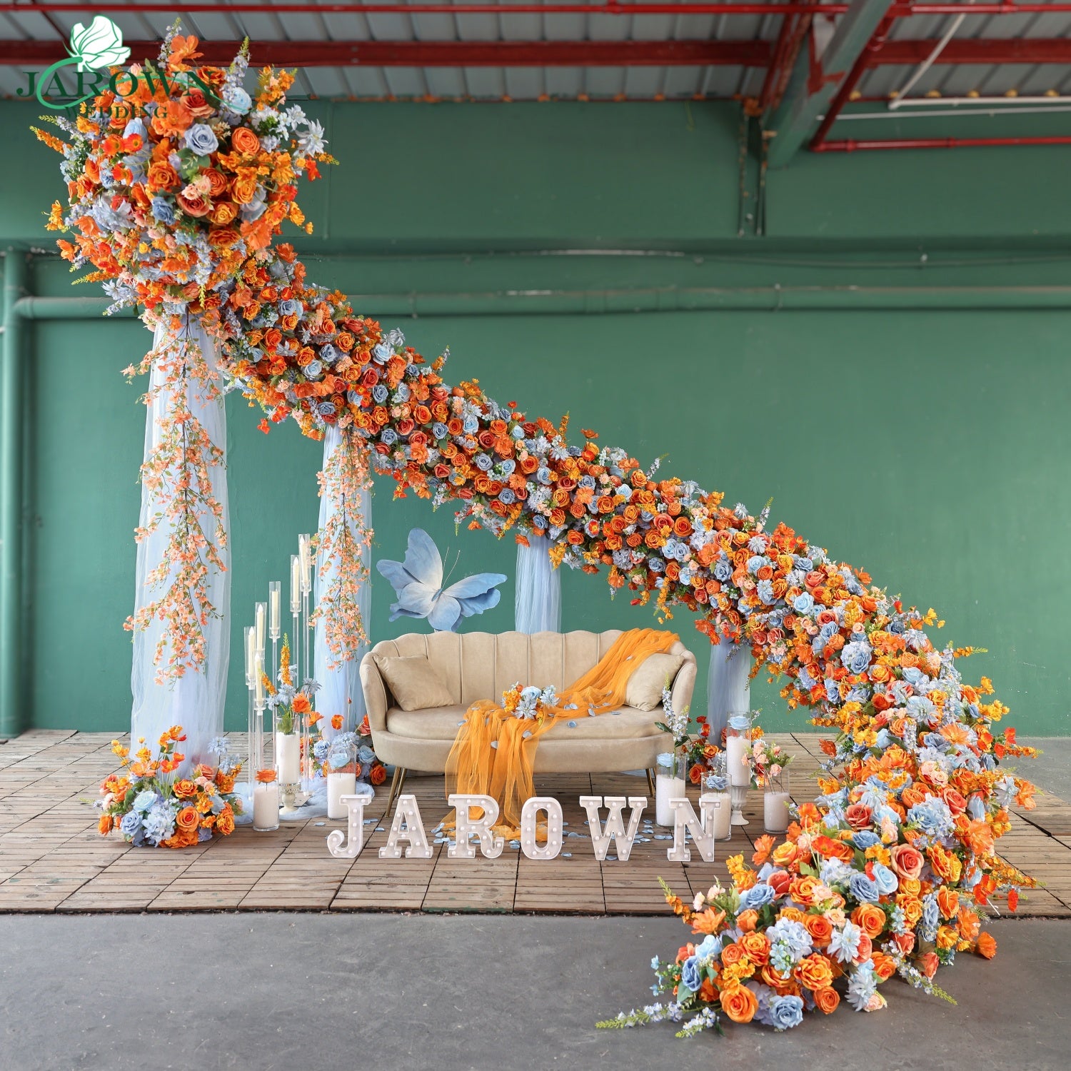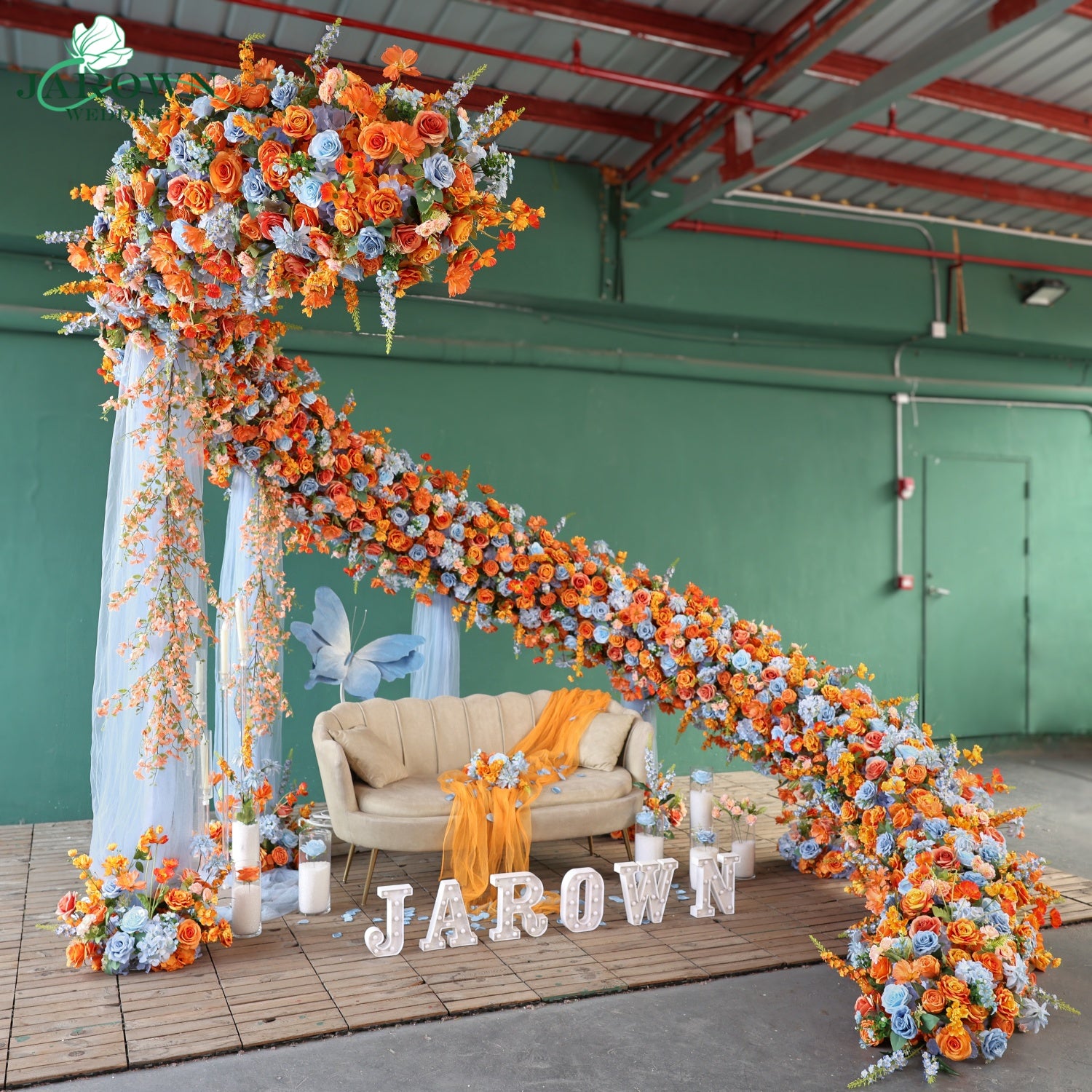 Unusual-Shaped Flower Arch in Orange/Blue